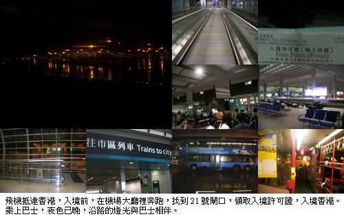 飛機抵達香港時,已經是晚上八點多,機外的跑道濕濕的,剛下過雨的樣子,我和兔兔在超級無敵大的香港國際機場上奔跑,為了找到21號閘口,領回我的香港入境許可證。跑了很久,找到21號閘口,才看見有人搭乘機場內的小車子,我和兔兔上氣不接下氣的簡直傻眼。走到入境窗口前,長長的隊伍,排著世界各地的人,等到輪到我們的時候,才知道忘了填入境申請表。本來在機上,空姐有發這個單子讓我們填,我和兔兔都沒注意到,只好再回過頭去填,再重新排隊。
