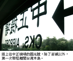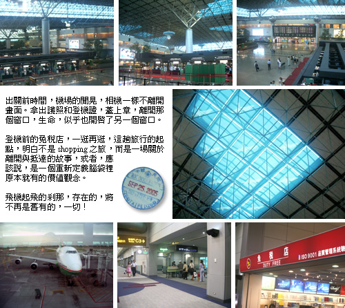 中正機場的第二航廈從一進門,就看見「出境大廳」四個字的指標,一邊拉著行李箱,一邊拍照。兔兔接過行李箱,讓我照個夠,她說:「你算是幸運了,第一次出國就從第二航廈出境,至少它看起來比較像國際機場。」我幾乎什麼都拍,「記者接待室」的指標、盥洗室的標示、電梯、手扶梯、盆栽、劃位人員、警察和滿是飛機起降及各國時間的看板,一一入鏡。這一切是那麼新鮮,是那樣的不一樣,好像不趕快照完,這些景象就會像夢一樣,從眼前消逝。